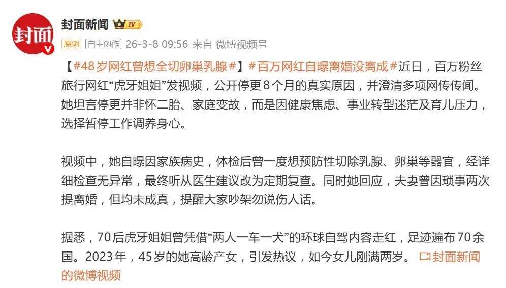 据3月8日报道,拥有百万粉丝的旅行博主“虎牙姐姐”一则回归视频,直接引爆了评论区。消失了整整八个月,外界猜测纷纭——是怀了二胎?还是家庭生变?她亲自下场,一口气澄清了所有传闻,并自曝了停更背后更为真实的中年困境:健康恐慌、事业迷茫,以及那场“两次都没离成”的婚姻风波。