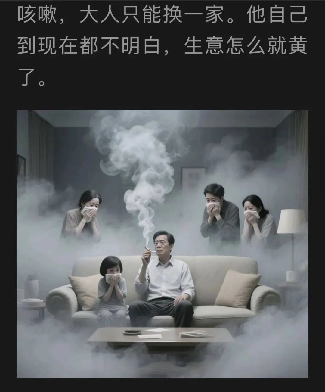 搭配这张“一人抽烟全家捂嘴”的 AI 图片一起服用,效果更佳。