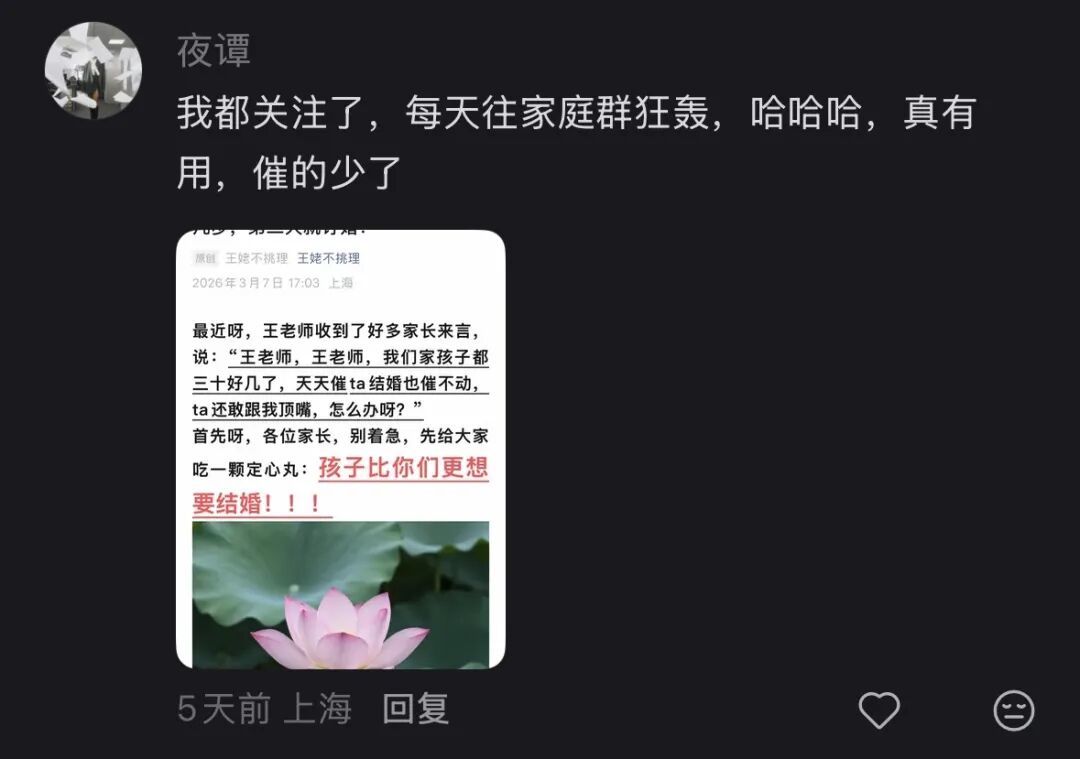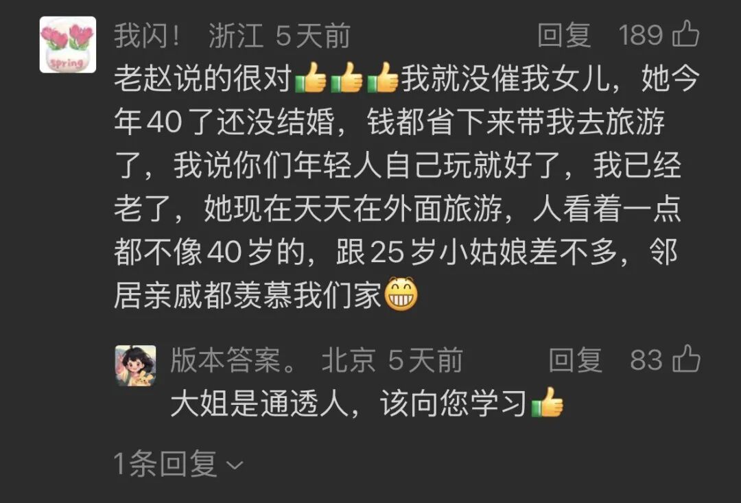 比起年轻人面对催婚的“不听不听,王八念经”,这招确实管用不少。评论区有很多正面评论:不催了以后,跟孩子的关系越来越融洽了;儿孙自有儿孙福;我就没催我女儿,她今年 40 了看着跟 25 岁小姑娘差不多。
