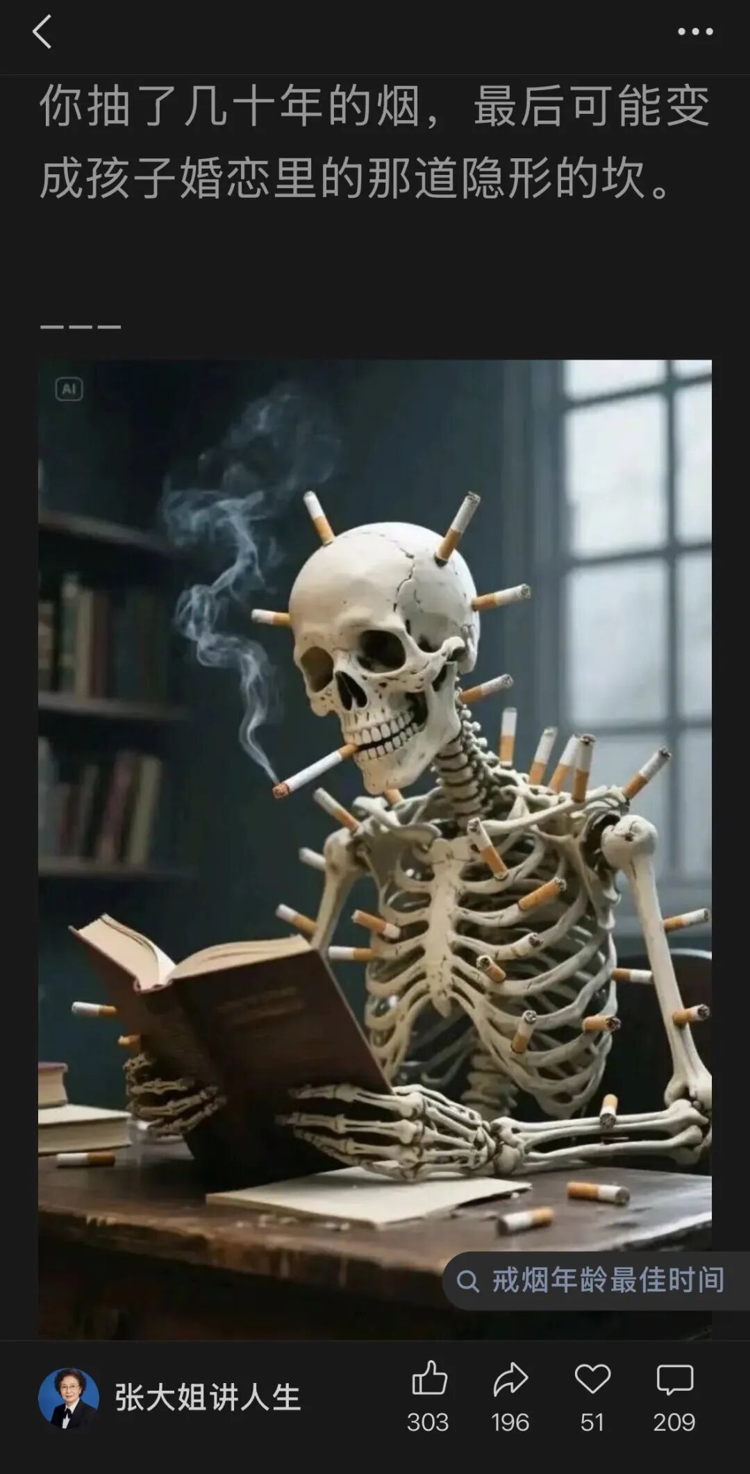 其实这些都是假的啦!假的专家头衔,假的观众留言,AI 生成的照片,AI 输出的洗脑文案,一切都是假的,只有“吸烟有害健康”是真的。